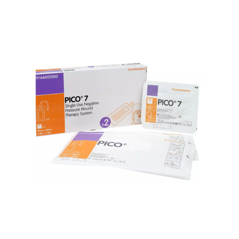 O Pico 7 é um sistema de utilização única para feridas, que utiliza pressão negativa para tratar feridas abertas e incisões cirúrgicas. Ajuda a promover a cicatrização, protegendo a ferida da contaminação externa, promovendo alterações no fluxo sanguíneo e melhorando a contração da ferida e a formação de tecido de granulação.