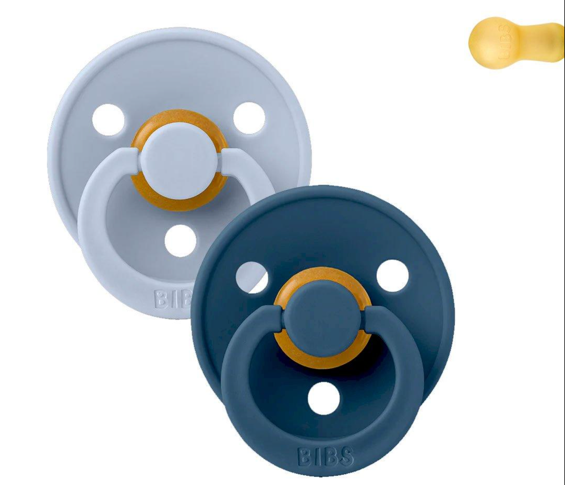Chupeta Tutete Bibs Color Round Dusty Blue/Steel Blue feita de PP, sem BPA, ftalatos ou PVC. Design redondo e macio que imita o mamilo materno. Indicado para bebés de 0 a 6 meses e em conformidade com o padrão EN1400.
