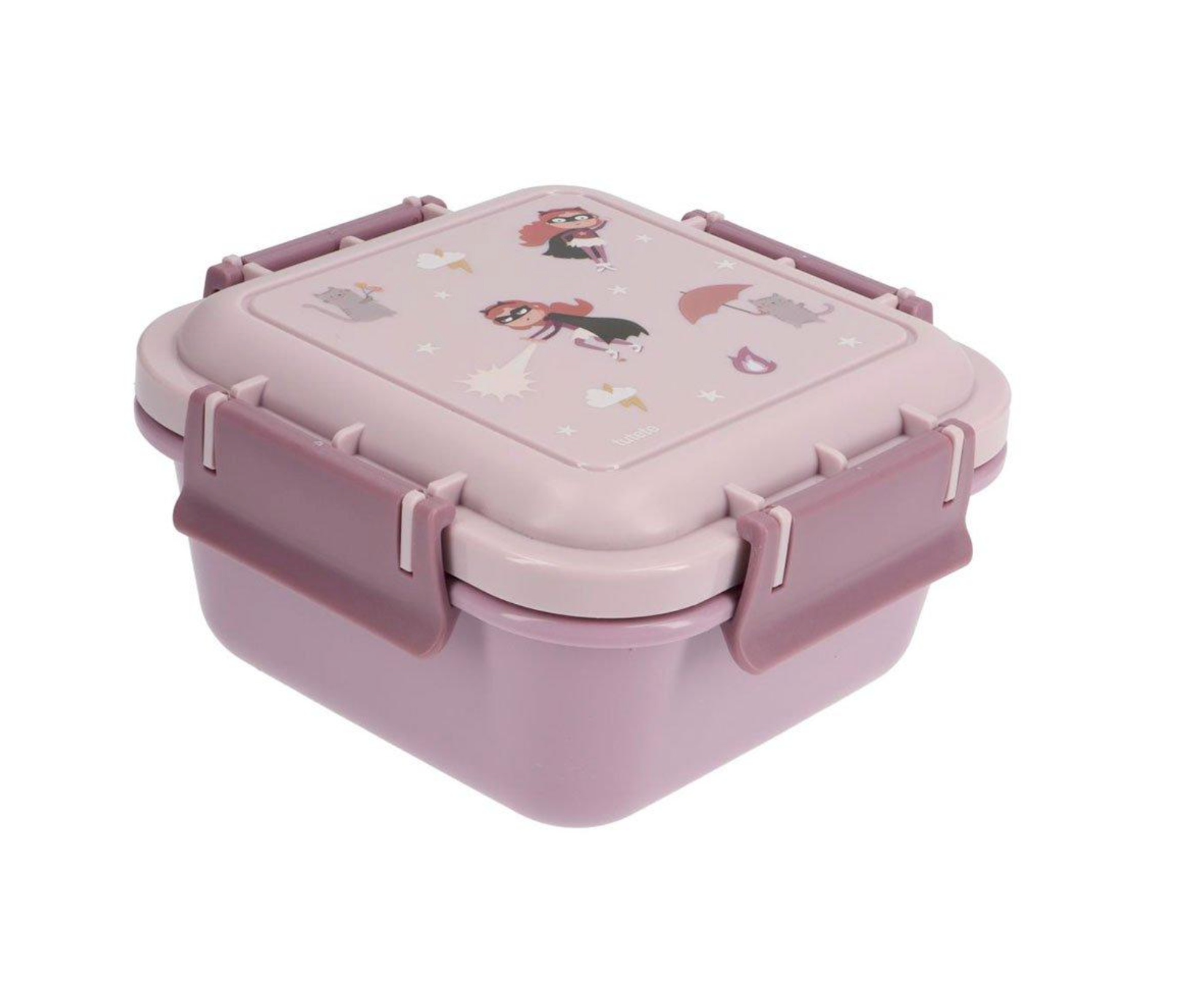 A Tutete lancheira grande fantastic girl pode ser aquecida no micro-ondas sem a tampa e tem um fecho hermético com 4 abas, garantindo que os alimentos se mantêm frescos e seguros.